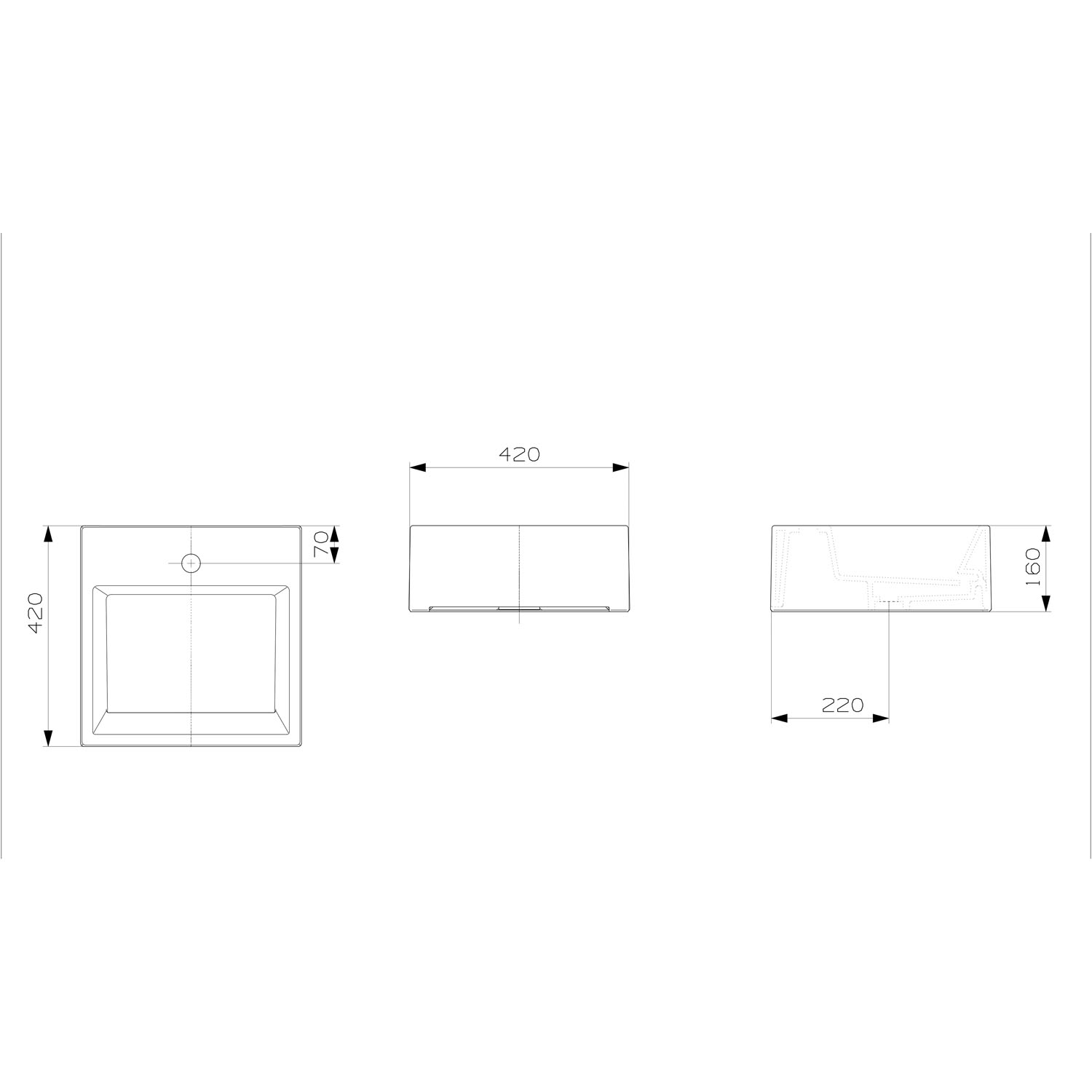 Cuba de apoio quadrada com mesa da Celite Importante: As dimensões dos produtos em louça sanitária têm uma tolerância de aproximadamente 10 mm.
