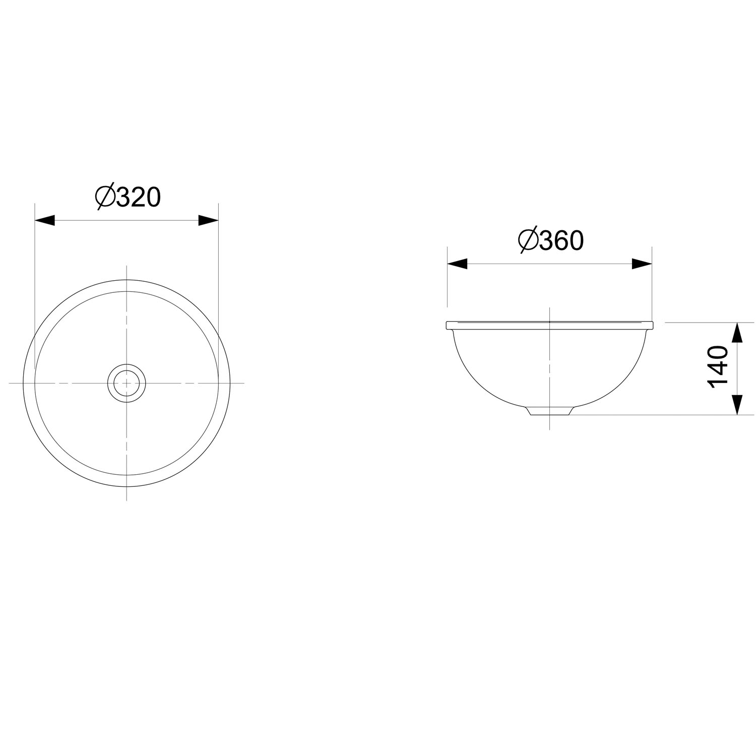 Cuba de embutir redonda da Celite Importante: As dimensões dos produtos em louça sanitária têm uma tolerância de aproximadamente 10 mm.
