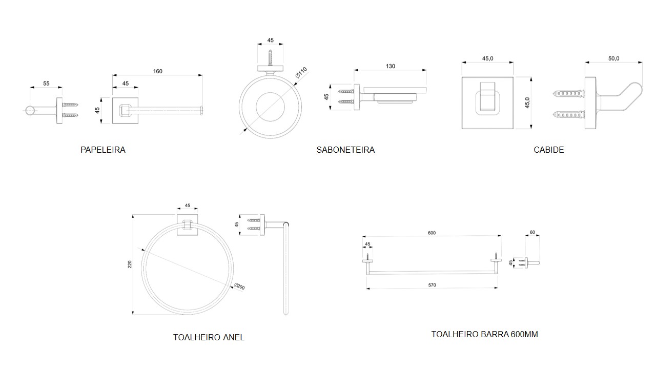 O kit Up é composto por 5 peças, sendo elas: Papeleira, saboneteira de vidro, toalheiro em anel, toalheiro em barra 600mm e cabide. Também acompanha a fixação necessária para a instalação de cada item.Observação