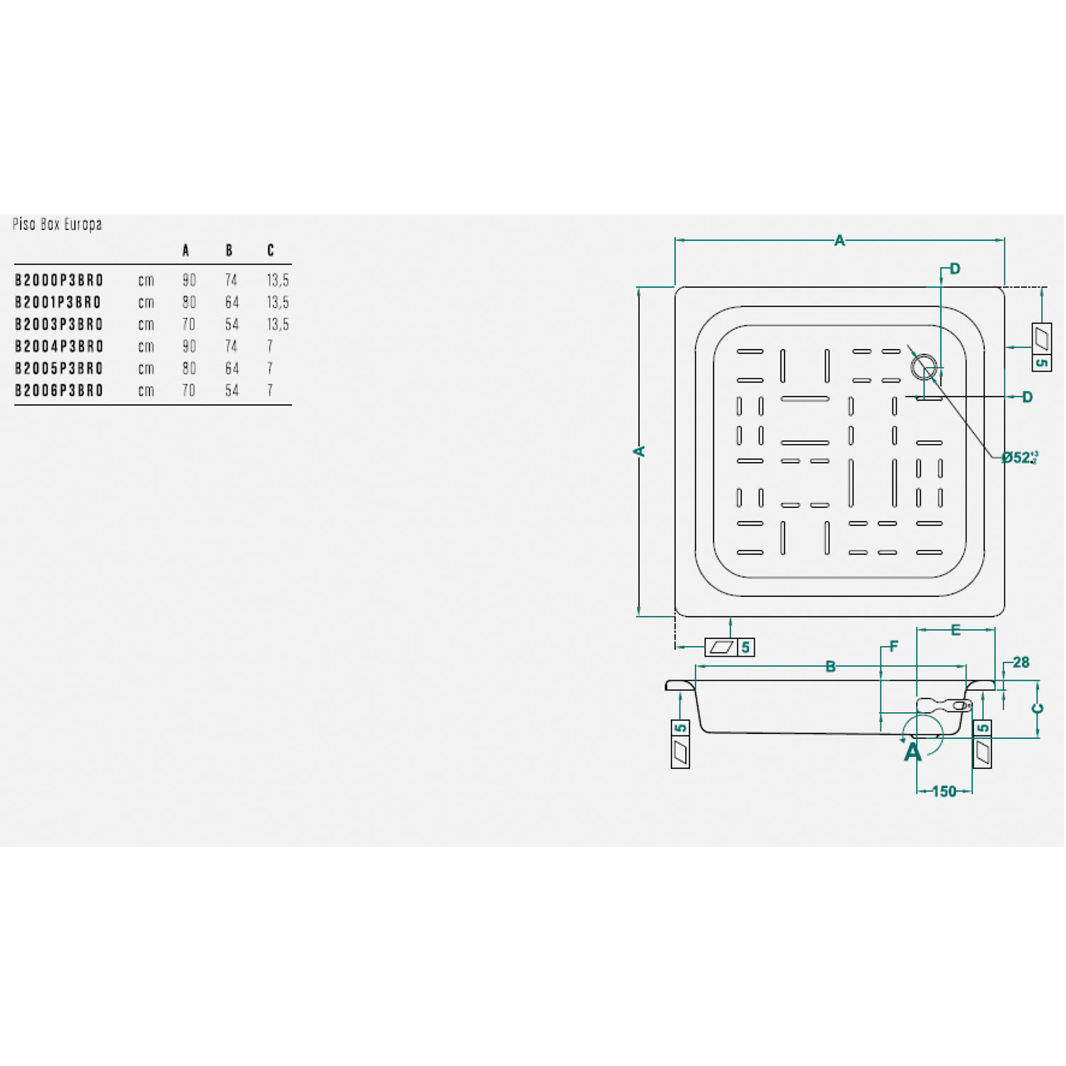 Piso Box para banheiro linha Europa da Celite, uma solução prática, durável e segura para áreas de banho Material: Aço esmaltado Vitrificado. Peso máximo do Piso Box Europa: 300 Kg Benefícios do Piso Box Europa Elimina os problemas de infiltração, umidade, água empoçada e ruídos, além de tornar a obra fácil e rápida. É produzido em aço esmaltado vitrificado, o que garante a conservação da cor original do produto evitando o amarelamento. É uma solução higiênica, de fácil limpeza e resistente a alta temperatura. Importante Para instalação do piso box Europa é necessário a válvula de escoamento que pode ser saída vertical ou horizontal. Estes itens não acompanham o produto e são vendidos separadamente. Procure pelos códigos: B2007P3CR3 - Válvula de escoamento, saída para o piso (Vertical). B2002P3CR0 - Válvula de escoamento, saída para parede (Horizontal).